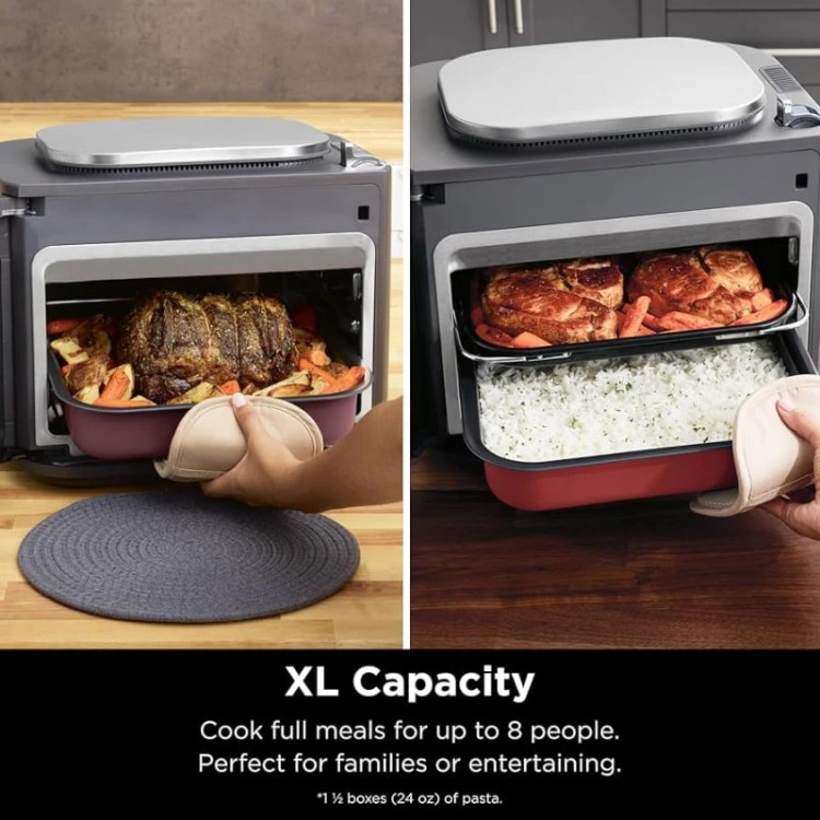 یک فر چند کاره هست که میتوان با 10 برنامه پخت مجزا با آن کار کرد. دیگر به روغن اضافی نیازی ندارد و غذا ها را با همان کیفیت و طعم شروع به پخت میکند. ظرفیت این مولتی کوکر نینجا مدل SFP700 با حجم 30 لیتری بوده و برای یک خانواده 10 نفره مناسب هست. توان مصرفی برای این محصول 1760 وات هست و دارای صحفه نمایشگر دیجیتال هست و همچنین کنترل پنل این سرخ کن دارای تاچ لمسی بوده و به راحتی میتوان برنامه پخت را تنظیم نمود. قطعات داخلی مولتی کوکر نینجا SFP700 را میتوان جدا کرد و شستشو داد، محفظه سرخ کن به راحتی قابل جدا شونده هست. دارای شستشوی آسان و جنس محفظه سرخ کن از نوع تفلون نچسپ بوده و از کیفیت خوبی برخوردار هست. مولتی کوکر نینجا SFP700 دارای قطع کن اتوماتیک هست و میتوان پس از تنظیم برنامه دلخواه آن را به حالت خود رها کرد و با خیال راحت به دیگر کارهای منزل رسید. این محصول دارای 10 برنامه پخت بوده و بنا به نیازی که داریم قابل تنظیم هست